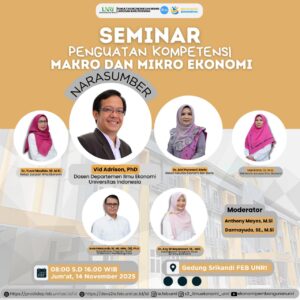 Unrinews. Jurusan Ilmu Ekonomi, Fakultas Ekonomi dan Bisnis Universitas Riau (FEB UNRI) pada Hari Jumat tanggal 14 November 2025, menyelenggarakan Seminar Penguatan Kompetensi Mikro dan Makro Ekonomi dengan menghadirkan narasumber nasional, Vid Adrison, Ph.D, Wakil Ketua APSEPI dan Dosen FEB Universitas Indonesia, pada Jumat bertempat di lingkungan FEB UNRI. Kegiatan dibuka secara resmi oleh Dekan FEB UNRI, Dr. Alvie Purwanti Alwie, SE., MM., merupakan langkah penting untuk memperkuat kualitas akademik dan mendukung visi UNRI sebagai perguruan tinggi yang adaptif dan berdampak.