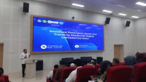 Unrinews. Dalam rangka implementasi kebijakan digitalisasi layanan dan peningkatan tata kelola dokumen akademik, Universitas Riau (Unri) menyelenggarakan Sosialisasi Penerapan Ijazah dan Transkrip Akademik Digital di Teater Kampar, Gedung Integrated Classroom, pada Senin (08/12).