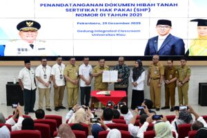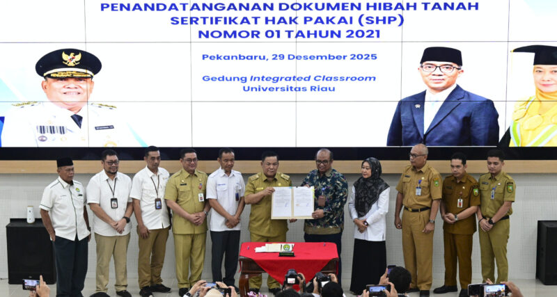 Unrinews. Universitas Riau (Unri) secara resmi melaksanakan penandatanganan dan serah terima hibah tanah dari Pemerintah Provinsi Riau kepada Kementerian Pendidikan Tinggi, Sains, dan Teknologi, yang di tanda tangani oleh Ir Sofyan Pranyata Harianto MT selaku Pelaksana Tugas Gubernur Riau dengan Dr Agus Sunarya Sulaeman SST Ak MSi selaku Kuasa Mentri Pendidikan Tinggi Sains dan Teknologi yang juga merupakan kepala biro Keuangan dan Barang Milik Negara Kementerian Pendidikan Tinggi Sains dan Teknologi serta Rektor Unri Prof Dr Sri Indarti SE MSi pada Senin (29/12/2025). Kegiatan ini berlangsung di Gedung Integrated Classroom, Ruang Teater Kampar, Kampus Bina Widya Universitas Riau, Pekanbaru.